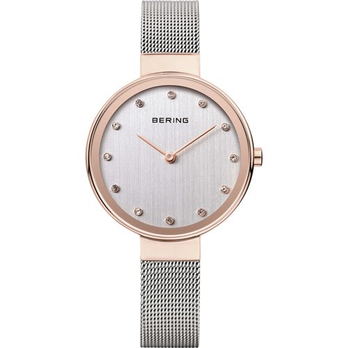 Klassische Zeitsammlung Bering Damen Nur Zeituhr. 34 Mm Dimension Case, glänzendes rosa Gold und aus Edelstahl. Modell mit silberfarbenem Strap, Made in Mailand, mit Shutter Release. Diese silberne Zifferblattuhr, mit Saphirglas. Finishing ist Pink Oro Ip. Quarzwerk Modell und 3 Atm Wasserresistenz. Zusätzliche Features: Swarovski Steine, 3 Jahre Garantie.