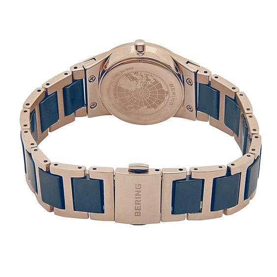 Uhr in Keramik und Rotgold laminiert Stahl, Durchmesser mm.26, Quarzwerk, Zifferblatt blau Perlmutt, Lünette und Indizes mit Swarovski-Kristallen, Saphirglas. Wasserdicht 5 atm., 3 Jahre Garantie.