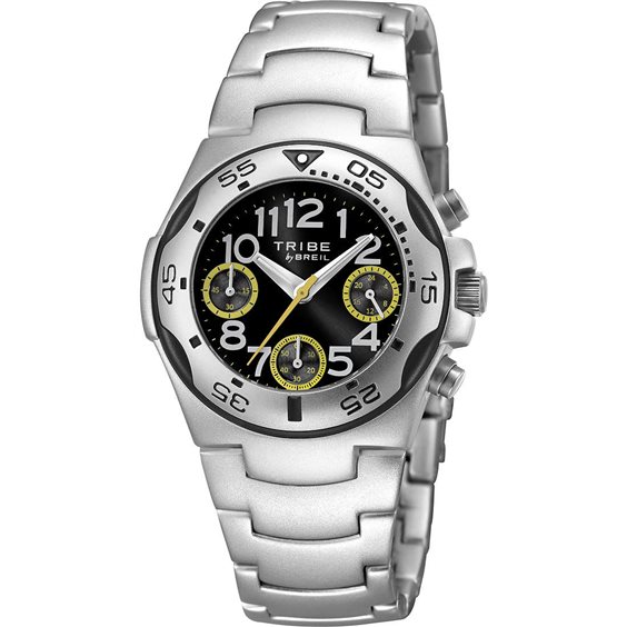 Chronograph mit Quarzwerk Zeitmodul VD54, 35 mm Aluminiumgehäuse. Schwarzes Zifferblatt mit gelben Details und leuchtenden Kugeln. Schwarzes Aluminiumarmband mit Faltschließe mit Sicherheitsverschluss. WR 5 atm.
