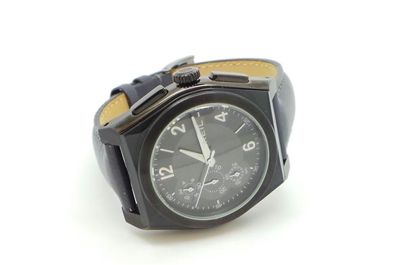 Uhr mit brüniertem Stahlgehäuse, 42 mm Durchmesser, graues Zifferblatt. Chronograph mit Quarzwerk. Graues Lederarmband mit Dornschließe. WR 10 atm.