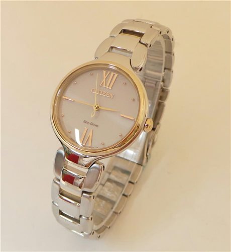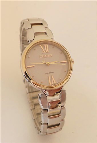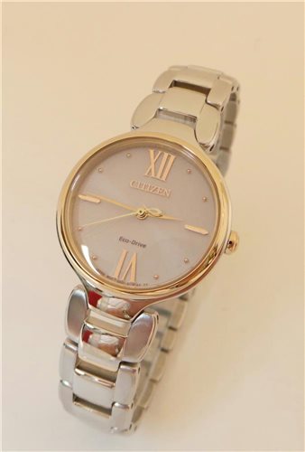 Nur Zeituhr. Glänzender Stahl, Lünette und Krone in glänzendem Gelbgold (PVD), Ø 28 mm. Dicke 8,3 mm. Armbandkörper 15/14 mm. Eco-Drive-Bewegung (mit unbegrenzter Lichtladung), 240-Tage-Ladungsreserve: Stunden-Minuten-Sekunden. Mineralglas. Opalisiertes weißes Zifferblatt (linke Seite 'Soleil'), Index und polierte Zeiger. Verstellbares Armband aus poliertem und satiniertem Stahl mit zweifachem Druckknopfverschluss. Wasserdicht 5 Atm. Gewicht 63 Gramm Garantie 2 Jahre.
