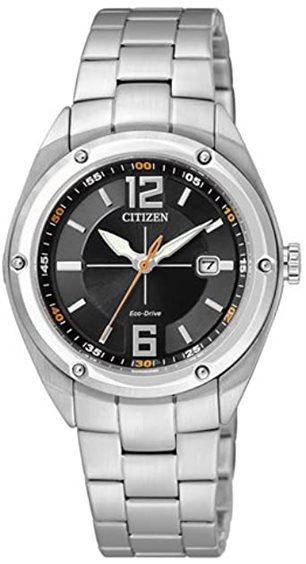 Uhr mit satiniertem Stahlgehäuse, 41mm Durchmesser, mit verschraubtem Boden. Schwarzes Zifferblatt mit Mineralglas. Nur Zeit mit Datum. Armband aus gebürstetem Stahl. Eco Drive Bewegung (unendliche Lichtladung). Wasserbeständigkeit 10 BAR.