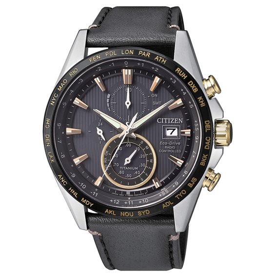 Chrono Super-Titan Eco Drive funkgesteuerter 5-Kanal Sportler (Signalempfang aus USA, Europa, Japan und China), Gangreserve 2 Jahre mit Anzeige der Restladung auf dem Zifferblatt - 24 Stunden Zeiger - Tageszeiger - Weltzeit mit 26 Städte und Zeit UTC, Chronograph mit 1/5 Sekunden-Scan, ewiger Kalender. Mattes und glänzendes Gehäuse aus Titan - schwarze Lünette. ø 42/43 mm. Dicke 10,5 mm. Saphirglas abriebfest. Indexiertes schwarzes Zifferblatt und Zeiger (Leuchtmasse) in Roségold. Strap in matt schwarzem Kunstleder. Wasserdicht 10 bar (100 Meter).