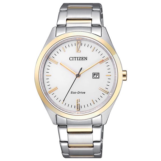Uhr nur Zeit. Poliertes und gebürstetes zweifarbiges Stahlgehäuse. Griff 18 mm. Eco-Drive Quarzwerk mit leichter Ladung und 180-Tage Gangreserve. Mineralglas. Weißes Zifferblatt mit Zeiger und glänzenden Ziffern in Gelbgold. Verstellbares Armband aus zweifarbig poliertem und gebürstetem Stahl, Faltschließe mit Knöpfen. Wasserdicht.