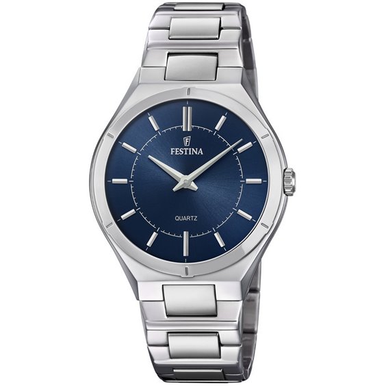 Herrenuhr aus 316L Edelstahl, Quarzwerk M9T22, nur Uhrzeit, blaues Zifferblatt, 38 mm Gehäuse, Mineralglas, Druckboden, verstellbarer Armband aus poliertem Stahl, Faltschließe mit Doppelknopf.