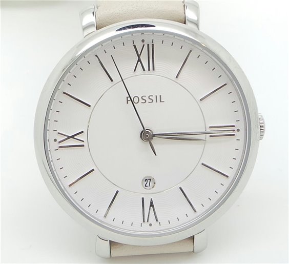 Zeit nur Uhr, Quarz, mit poliertem Stahlgehäuse, 36mm. Weißes Zifferblatt. Grau / Beige Lederarmband mit polierter Stahlschnalle. 3 ATM Wasserbeständigkeit.
