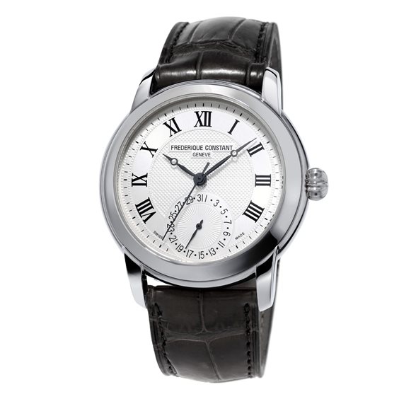 FC-710MC4H6 - FC-710 Automatikwerk, 26 Steine, 28'800 alt / h und 42 Stunden Gangreserve, mit Stunden, Minuten, Sekunden, Manuelles Datum. Edelstahlgehäuse 42 mm Durchmesser mit konvexem Saphirglas und 2-O-Ringe Krone, Höhe 11,6 mm. Wasserdicht bis 5 ATM. Silber, Guilloche-Dekor, aufgedruckte römische Ziffern. Lederband.