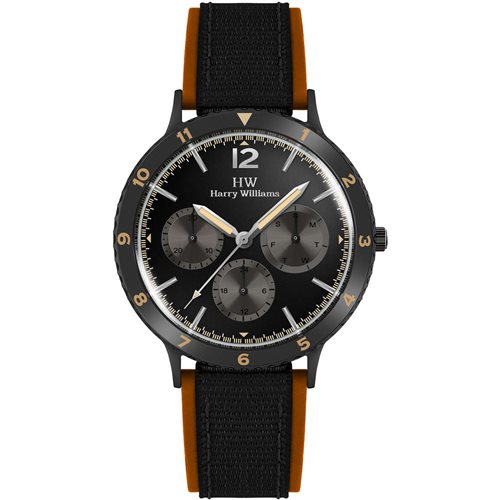 Harry Williams Herren Multifunktionsuhr Wembley Kollektion. Modell mit Stahl Case Of schwarzer Farbe, Del Durchmesser von 42 mm mit schwarzen Zifferblatt-Grau, Schlüssel Zahlen mit arabischen und Lederband Farbe Orange und Fertig Stoffe. Uhr mit Bewegung Vx7J, ausgestattet mit Datum und Wasserdichtigkeit von 3 Atm.