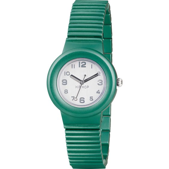 Hip Hop Uhr, neu mit grünem Aluminiumarmband, kompatibel mit Gummibändern. Hintergrund mit Zahlen und Datum, Hände mit Luminol. Verschraubter Stahl zurück.