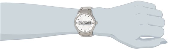 Schauen Sie sich Just Cavalli Huge Frauen; Durchmesser 38 mm; Silber-Zifferblatt mit Mineralglas geschützt; in einem runden Gehäuse aus Edelstahl mit Kristallen auf der Lünette; Armband.