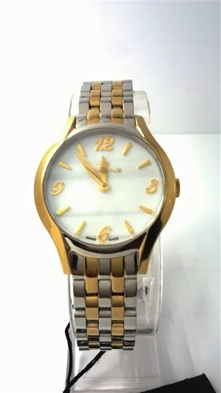 Elegante zweifarbige Edelstahl Damenuhr mit Perlmutt-Zifferblatt Gold Zahlen 3, 6, 9, 12 und Gold-Indizes in Ruhe.