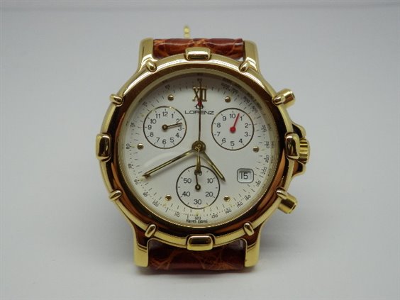 Chronographenuhr mit Datumsanzeige bei 4 Uhr, Tachoanzeige auf dem Zifferblatt, gelbvergoldetes Gehäuse Schweizer Quarzwerk. Braunes Krokodilband.