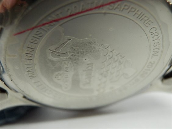 Quarzuhr mit Quarzwerk 955112, Zifferblatt mit applizierten und lumineszierenden Punktmarkern, Datum bei 3 Uhr, einseitig drehbare Krone mit verschraubter Krone wie der Gehäuseboden, Stahlband mit integrierter Verbindung zum Gehäuse und Schließfach mit Sicherheitsverschluss.