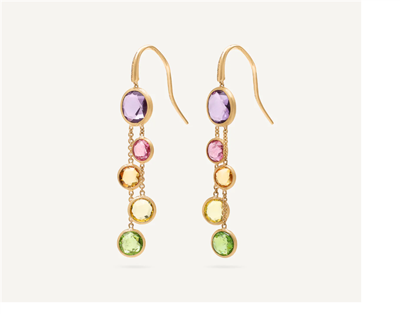 Ohrringe aus 18 kt Gelbgold, handgraviert mit der alten Technik von Bulino. Diese Ohrringe tragen eine Auswahl an mehrfarbigen Rosenschliff-Kissensteinen.