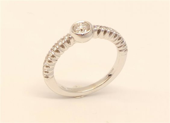 Glitzer Weißgold Ring (18kt) mit einem zentralen runden gegossenen Diamanten und kleinen diamantgravierten Seiten (ct. 0,50 insgesamt). Internationales Echtheitszertifikat.