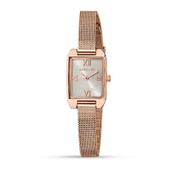 MORELLATO Uhr aus der SENSYS Serie, rechteckiges roségoldfarbenes Gehäuse, Größe 17x26 mm, silbernes Zifferblatt und Silbergoldarmband mit Milan Mesh