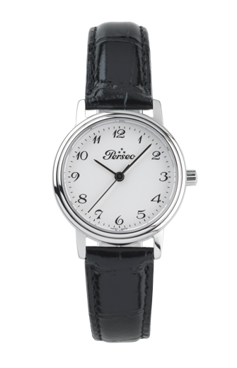 Uhr nur Zeit Frau. Stahlgehäuse, Schweizer Ronda Quarzwerk, Mineralglas, weißes Zifferblatt, arabische Stundenindexe. Schwarzes Armband aus Kalbsleder mit Krokoprägung. Wasserdicht 5 bar (50 Meter)