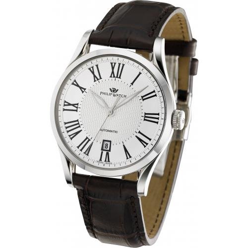 Sonnenstrahl-Sammlung. Silbernes Zifferblatt mit römischen Ziffern und Datumsanzeige bei 6 Uhr, Lederarmband mit Dornschließe