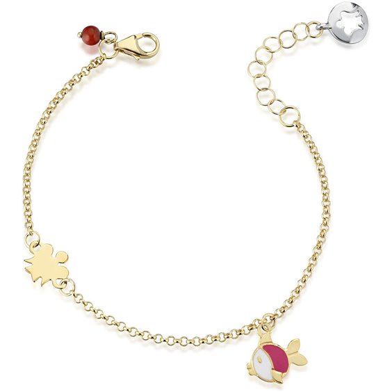 Baby-Armband oder kleines Mädchen von Roberto Giannotti aus der Baby-Kollektion. Armband mit Gelbgold Engel und Charme in Form eines Fisches mit weißer und rosa Emaille und roter Koralle Charme. Die Länge des Armbands ist 12/14 cm, 0,7 cm Engel mit Base und Höhe 0,7 cm, 0,8 cm Pesciolino mit Sockel und Höhe 0,6 cm Durchmesser und Coral: 2 mm