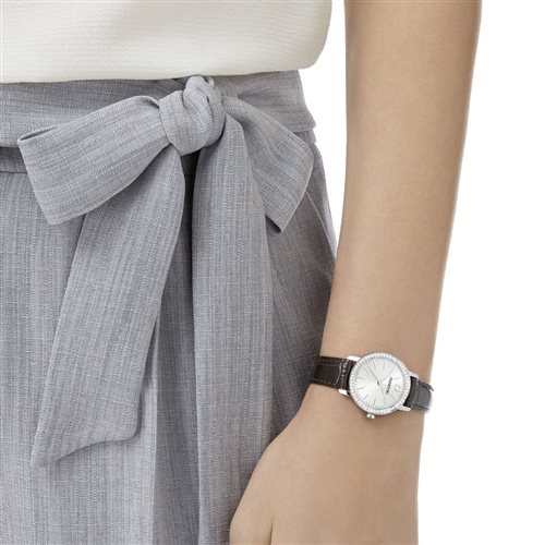 Perfekt für jeden Anlass, ist das neueste kompakte Fußabdruck-Design mit einem echten schwarzen Lederarmband abgestimmt. Ein silbernes Radialmuster und eine 54% Clear Crystal geprägte Lünette ergänzen dieses prächtige Handgelenk-Instrument mit unwiderstehlicher Brillanz. Gehäuse 29 mm; wasserdicht bis 50 m; Swiss Made.Abmessungen des Zifferblattes: 29 mmLänge des Armbands: 18,5 cm Art.Nr.