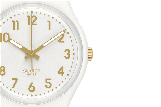 Unisexuhr CASE WITH PLASTIC Band schwarz und weiß in Silizium-, CLOSING Dorn, DIAMETER CASE 34 mm DICKE CASH 8,75 MM, ANSA 20 mm 16,9 WEIGHT GRAMM, DIAL Farbe: weiß mit GOLDEN INDICES, Quarz, WR 3 Bar / 30 MT, GLASS Plexiglas, 2 Jahre Garantie OFFIZIELLE SWATCH SWISS MADE.SCATOLA GARANTIE.