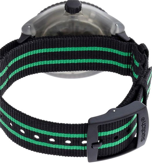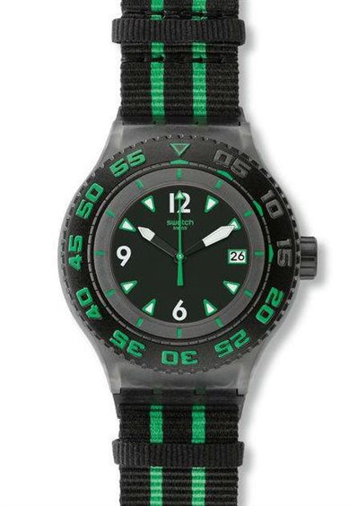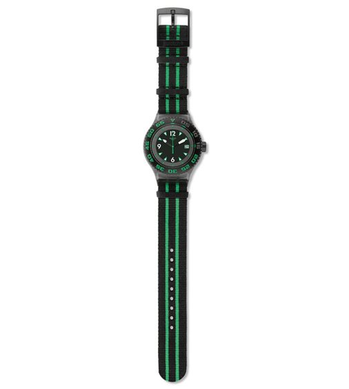 Swatch Scuba Libre Deep Turtle Uhr mit 42mm Plastikhülle, schwarz und grün technischer schwarzer Riemen mit schwarzer Plastikschnalle, unidirektionaler Drehring, Quarzwerk, wasserdicht bis 200 Meter.