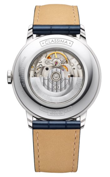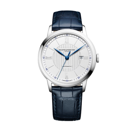 Automatic stainless steel men's watch, 42 mm round dial, Classima 10333 features Swiss-made automatic movement, blue alligator strap, silver-colored dial with guilloché decoration, sapphire crystal case back. New and original product, equipped with instruction manual and Baume INTERNATIONAL WARRANTY