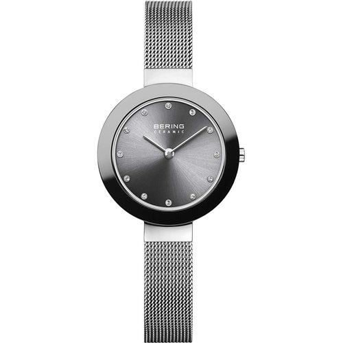 Clock Only Time From Woman Of Bering Of Ceramic Collection. Model With Silver Polished Stainless Steel Case And Diameter Of 29Mm. Sunray Dial In Gray Color, Ceramic Bezel In Silver Color And Sapphire Glass. Steel Strap With Milanese Jersey Of Gray Color With Safety Closure. Clock With Quartz Movement And Water Resistance Of 5 Atm.