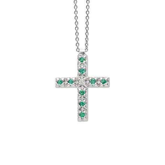 Cross necklace in White Gold, Diamonds and Emerald. 0.01 ct. of Diamond. 0.05 ct. of Emerald