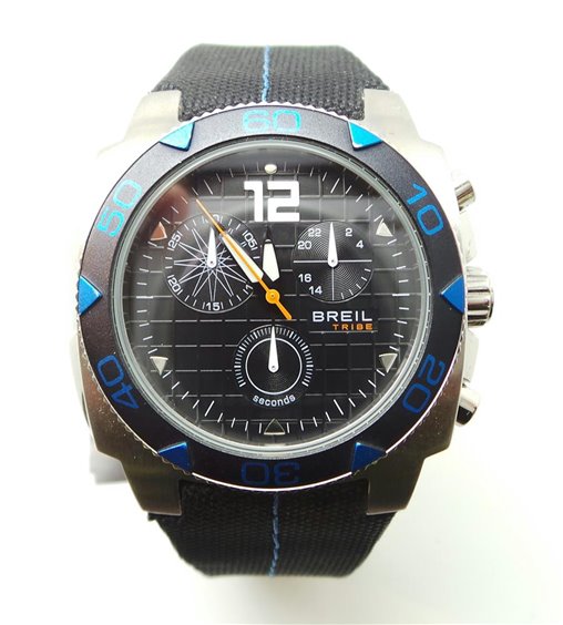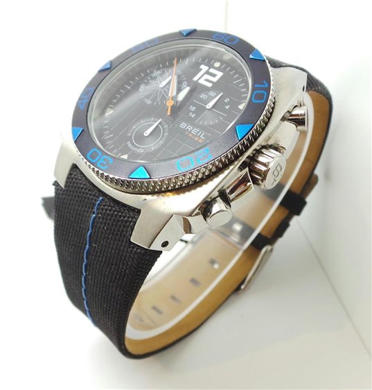 Chronograph, stainless steel case, cloth and leather strap, quartz movement chromo, mineral crystal, screw back, water resistant 100m