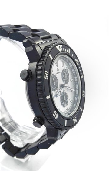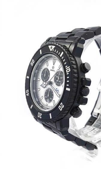 BREIL Watch collection MANTA reference Z960 - Diver Chronograph Alarm - W.R. 20 atm. Quartz chronograph watch. Steel 40 mm black case (black PVD) - Silver dial with luminescent indices and hands. At 2 o'clock centimeters of seconds and minutes - at 6 o'clock seconds - at 10 o'clock chronograph hands. The three counters are black. Unidirectional rotating black bezel with white immersion times. Alarm crown protected at 3 o'clock. Screw clock at 4 o'clock. Window clock at 6 o'clock. Functions: Hours, minutes, small seconds, date, 3 counters chronograph and alarm. Glass: mineral. Black solid black leather bracelet (black PVD) with retractable closure and personalized buckle. Closed screw cap. Tachometric scale on rehault. Waterproof: 20 ATMs.