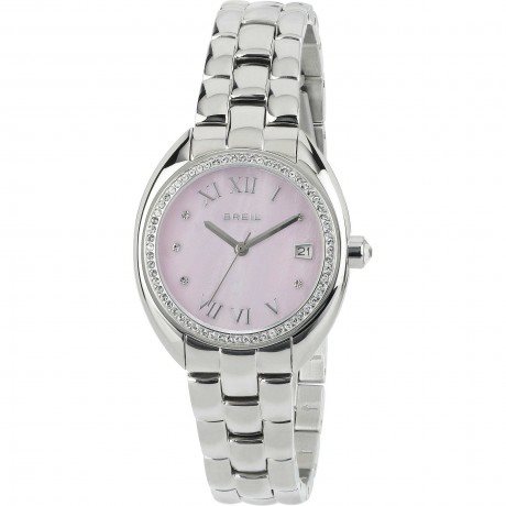 Breid woman watch Claridge collection. Steel case, pink mop dial with stones, bezel with stones, mineral glass. steel bracelet in steel with buttons closure. myota quartz movement.