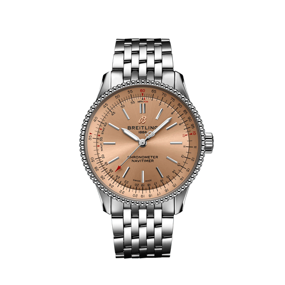 Refined and elegant, the Navitimer Automatic 35 combines the historic appeal of a true icon with the sophistication of a contemporary timepiece. Available in a variety of materials including stainless steel and 18k red gold, the 35 mm case features a beaded bezel and a range of elegant dial colors, as well as diamond-set white mother of pearl. Offered either with a matching bracelet or alligator strap that fits both a stainless steel pin or folding buckle, the Navitimer Automatic 35 is powered by the Breitling Caliber 17, a COSC-certified chronometer.
