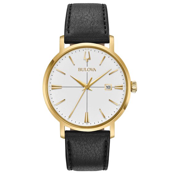 Gold-tone stainless steel case, silver-plated dial with golden details and three-hand calendar, mineral glass with box, smooth grained black leather strap with three-piece buckle and water resistance up to 30 meters.