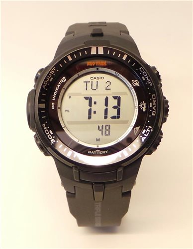 Multifunction watch.Made in matte black resin, steel bottom, Ø 44mm. 12.4mm thick. Tough Solar digital quartz movement (solar charge or any type of light) Multi Band 6 (radio-controlled 6 frequencies: UK.-D-USA-Japan-China), three sensors: digital compass, barometer / thermometer, altimeter. International time 48 cities (31 time zones), stopwatch 1/100 sec. Timer. 5 daily alarms (alarm clocks). Sunrise / sunset display. Mineral glass. Positive dial, LED lighting. Black resin strap. Waterproof 10 atm. Weight 63 grams. Warranty 2 years.
