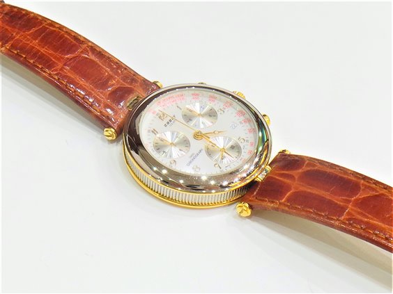 Clock man brand CADET chronometer scale speedometer steel and 18 kt gold-plated. machining of hollow-motion scallop movement made in swiss case diameter 38 mm. Crocodile print leather strap
