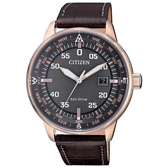 Clock only time. Steel case with pink gold PVD coating. Screw-locked bottom, 20 mm handle. Eco-Drive quartz movement with light charge with 180-day power reserve. Mineral glass. Black dial and bezel with cardinal point indicator - luminous hands at 3 o'clock. Dark brown leather strap. Water resistance 10 atm. New and original product, equipped with an instruction manual and a 24-month Citizen INTERNATIONAL WARRANTY.