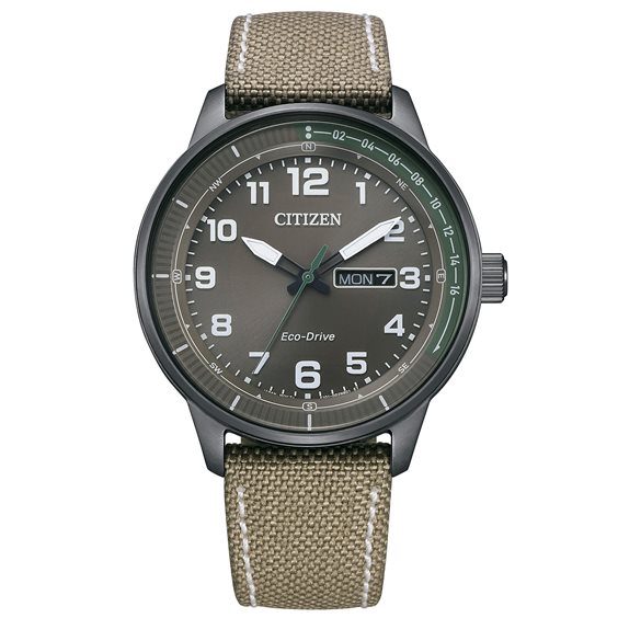 BM8595-16H – Men’s 42 mm solar stainless steel watch with brown dial and fabric strap A military-inspired watch that balances eco-friendly technology and rugged design. Featuring a 42 mm black-ion plated stainless steel case with a brown dial displaying Arabic numerals, green-tipped second hand, and a day/date window at 3 o’clock. Powered by a solar movement with a 6‑month power reserve, it eliminates battery replacements. The mineral crystal offers durable protection, while the screw-down crown and case back ensure 10 ATM water resistance. The technical fabric strap with leather backing and pin buckle combines comfort and toughness. Case diameter: 42 mm Movement: Solar with ~6-month reserve Caliber: E101 Crystal: Mineral Functions: Time only, day and date Strap material: Fabric with leather backing Clasp: Pin buckle Crown: Screw-down Case back: Screw-down Water resistance: 10 ATM (100 meters) Gender: Men’s Style: Military-casual Praised for its reliability and value, consumers call it: “It’s my daily driver”