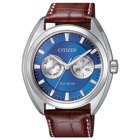 Multi-function clock. Polished and brushed steel case with screw-locked bottom, 22 mm handle. Eco-Drive movement with light charge with 180 days power reserve. Mineral glass. Blue dial with day and date silver counters. Bright hands. Leather strap
