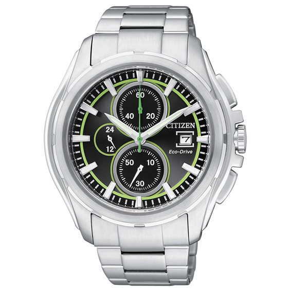 Eco Drive Movement (winding infinite light), with a power reserve of 210 days. Functions Chronograph to 1/5 of a second. 24-hour display. Features stainless steel case and bracelet with push-button safety clasp. WR 10 bar. Black dial with green piping. Back pressure. Mineral glass. Dimensions Case diameter 45 mm, weight 149 grams.
