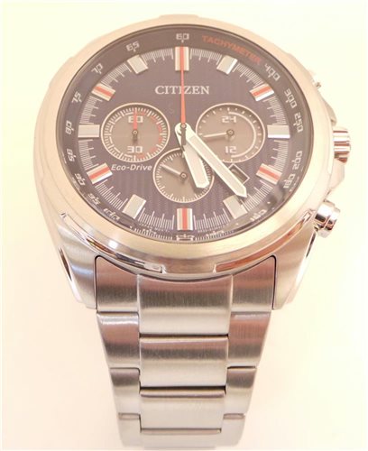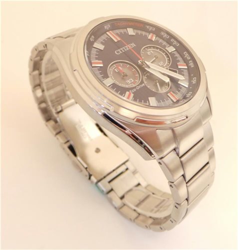 Chronograph Watch. Stainless steel brushed and shiny, Ø 45 mm, 12.7 mm, thickness 24 mm loop. Quartz movement, Eco-Drive (at light loads) with reserve of 270 days, Chronograph to 1/5 sec. up to 60 minutes. Mineral glass. Blue Guilloche Dial with red details, index and hands luminor. Adjustable bracelet with brushed and polished steel with two-button clasp. Water resistant 10 Atm. Weight 174 grams. 2 years warranty.