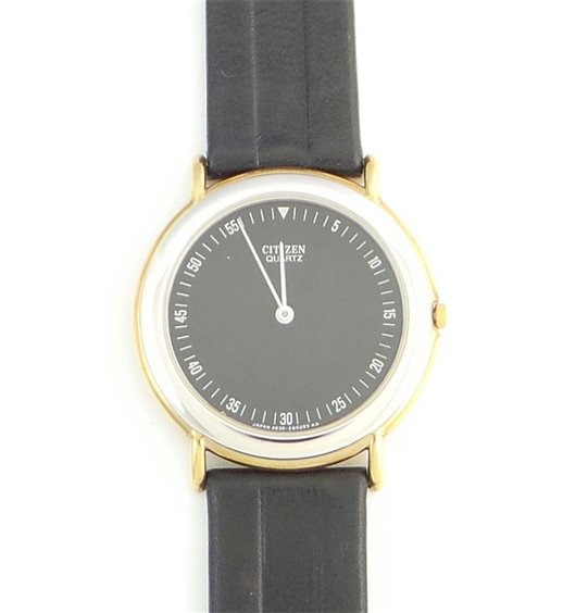 Citizen Quartz watch. woman, 33 mm polished steel case with gold inserts. Bottom pressure, black dial with spheres and white numbers and Arabs, black leather strap. 2 years warranty.