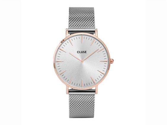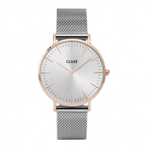 Women's Only Time Clock Of Cluse Of La Bohème Collection. Model Made Of Steel And Pvd Rose Gold. This Watch Has 38Mm Case, With Rose Gold PVD Finish, Bright White Silver Color Dial And Mineral Glass. The Case Has A Thickness Of 7 Mm. This Model Has Silver Metal Bracelet, With Buckle Jewelry. The Resistance to Water is 3 Atm. This Watch Features An Oversized Dial With Minimal Details And A Very Subtle Finishing. 2 YEAR WARRANTY CERTIFICATE