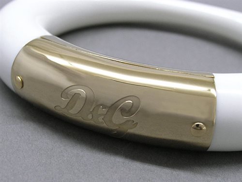 White resin bracelet with yellow gold pvd steel insert. Logo D