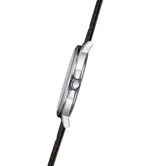 Elegant quartz men's watch with stainless steel case and blue leather strap. Blue dial with silver color indices and date on the six. Mineral glass; water resistant 5 ATM