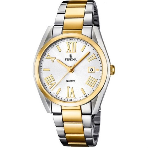 Just time watch Quartz watches for women with date on the "3"; case (35mm diameter) and steel strap with gold hypoallergenic practice button closure; silver dial; wr 5 ATM
