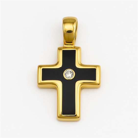 Men's cross pendant in 18 kt yellow gold with black enamel and central zircon – 2.90 g – Idee Preziose since 1987 A pendant with striking visual and symbolic appeal: this men’s cross in 18 kt yellow gold is enhanced by glossy black enamel that boldly outlines its shape. At the center, a sparkling zircon captures the light, adding elegance and depth. A bold and modern jewel for those who value both style and meaning. Material: 18 kt yellow gold Finish: Polished, black enamel Stone: Central zircon Weight: 2.90 g Gender: Men Pendant type: Contemporary cross Brand: Idee Preziose since 1987 Style: Bold, modern Occasions: Meaningful gift, daily wear, religious celebration A contemporary cross pendant with personality, made to be worn with pride.