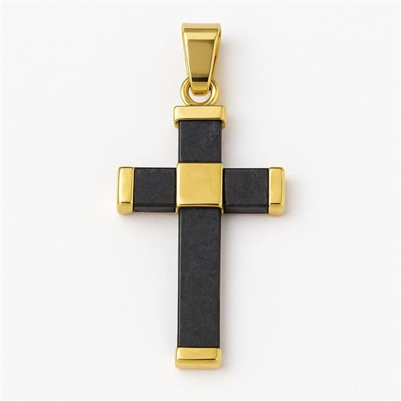 Men’s cross pendant in 18 kt yellow gold with black rubber – 1.50 g – Idee Preziose since 1987 A bold and masculine cross pendant crafted in 18 kt yellow gold with sleek black rubber inlays. The geometric lines and balanced proportions give this piece a modern and meaningful appeal. Perfect for those who want to express their faith with a contemporary edge. Material: 18 kt yellow gold and black rubber Weight: 1.50 g Gender: Men Pendant type: Cross Brand: Idee Preziose since 1987 Style: Modern, symbolic Occasions: Confirmation, meaningful gift, everyday wear A modern cross with strong personality – elegant, discreet and full of meaning.