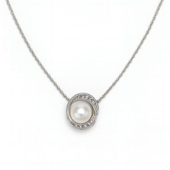 Women’s white gold necklace with pearl and diamonds – Idee Preziose Gioielli since 1987 Elegant Idee Preziose Gioielli since 1987 necklace crafted in 18 kt white gold, featuring a lustrous 8.5 mm white pearl surrounded by a circular pendant accented with natural brilliant-cut diamonds. A refined and timeless creation that enhances the natural radiance of the pearl. Material: 18 kt white gold Weight: 5.70 g Stones: 1 white pearl Ø 8.5 mm, natural diamonds ct 0.02 Cut: Brilliant round Gender: Woman A sophisticated and graceful jewel that embodies timeless elegance — Idee Preziose since 1987.