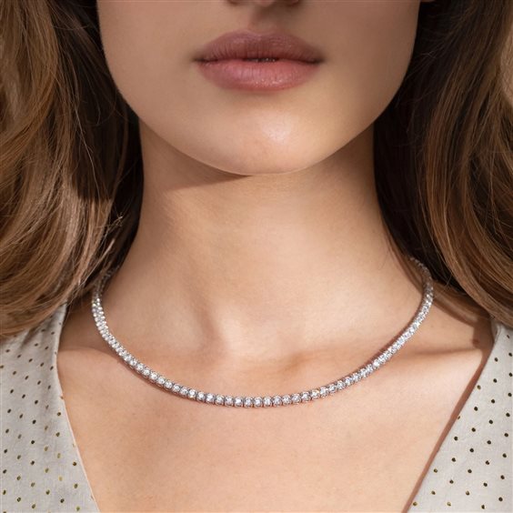 An everlasting classic with a touch of modern refinement. This 18 kt white gold tennis necklace features a continuous line of brilliant-cut white zircons, offering an exceptional sparkle and refined luminosity. The rigid central section ensures a perfect fit around the neck, keeping the necklace gracefully aligned at all times. A timeless creation that enhances every outfit, from everyday elegance to special occasions. A necklace that radiates pure brilliance — the harmony of white gold and zircon capturing the essence of timeless sophistication.